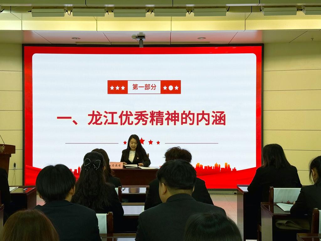 马禹茜以《传承红色基因,弘扬龙江优秀精神》为主题,从习近平总书记视察我省期间重要讲话重要指示精神起笔,讲述了老工业基地振兴发展中不断创新的智慧与汗水,首先开启了深挖龙江优秀精神的内容与内涵之路。让同学们深刻感受到了过去的黑龙江人民是如何用用智慧和汗水,为国家富强、民族复兴、人民幸福书写了可歌可泣的奋斗史诗,为当下龙江发展打造了坚固的基石。