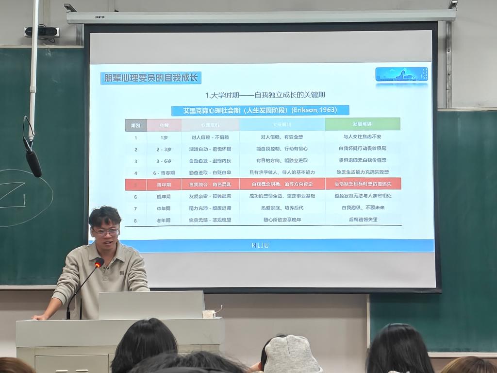 两位老师强调,朋辈心理联络员是为同学提供温暖支持的基层力量,也是连接学院与学生的重要桥梁,需主动关注班级同学的情绪状态与实际需求,及时反馈学生心理动态。同时,金鑫介绍了学校构建的“心理健康教育中心—学院二级心理辅导站—班级联络员—寝室联络员”四级心理健康工作体系,帮助联络员清晰自身在整体工作中的定位与职责边界。