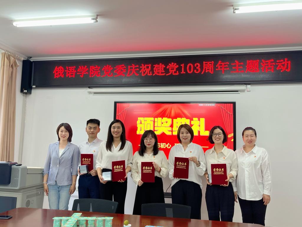 大会在庄严的国歌声中拉开帷幕。俄语学院党委书记黄东晶宣读表彰决定。号召全院师生党员对标榜样、凝心聚力,以实际行动庆祝中国共产党成立103周年,助力学院高质量发展。学院领导分别为荣获2022—2024年度优秀共产党员、优秀党务工作者、先进基层党支部的个人、集体代表颁奖。