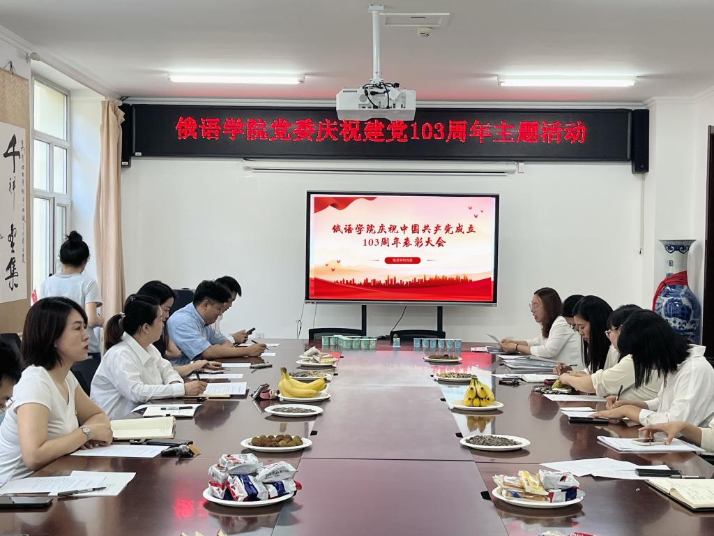 为庆祝中国共产党成立103周年,全面回顾党的光辉历程,弘扬党的优良传统,深入推进党纪学习教育,深化能力作风建设,进一步增强党组织的凝聚力和战斗力,激发广大党员干部的干事创业热情与活力,6月28日,俄语学院党委在主楼A418举办庆祝中国共产党成立103周年表彰大会。俄语学院党委班子成员、教工党员、受表彰集体和个人以及学生党员代表出席大会。