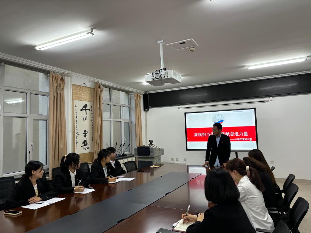俄语学院党委第六十九期党员发展对象培训班学员于6月4日开展了集中自学,并针对学习内容展开讨论。交流研讨以“展现担当作为,贡献奋进力量”为主题。15位学员紧紧围绕党员发展培训班中学习内容、实践锻炼等,分别谈体会、说感悟。吴国富同学分享到:”通过本次培训班的学习,我深刻感受到了新时代中国青年的使命与担当,更加坚定了共产主义信仰,课上老师说组织上入党一生一次,思想上入党一生一世,我热泪盈眶,我们要做到一旦信仰,一生信仰。”田懿丹同学分享到:“日后我将更加自觉学习党的章程,党的理论,坚持学思用相结合,将党的理论内化于心,外化于行。要将自己的个人抱负与国家理想相结合,在奉献中展现自我价值,实现理想抱负。”