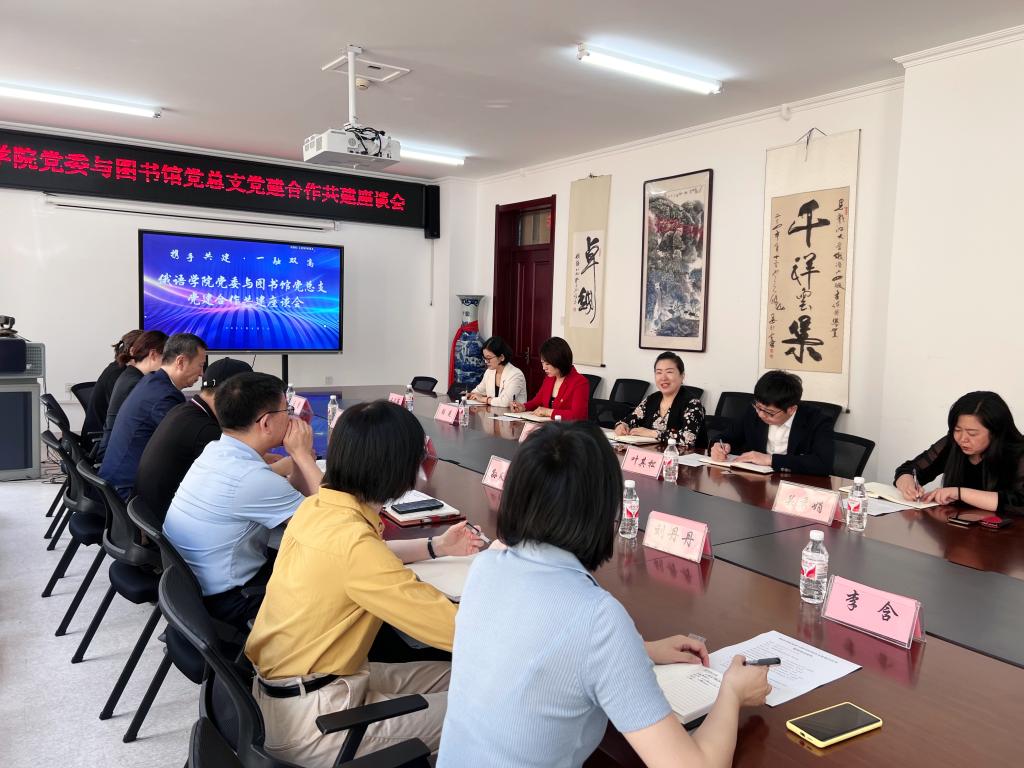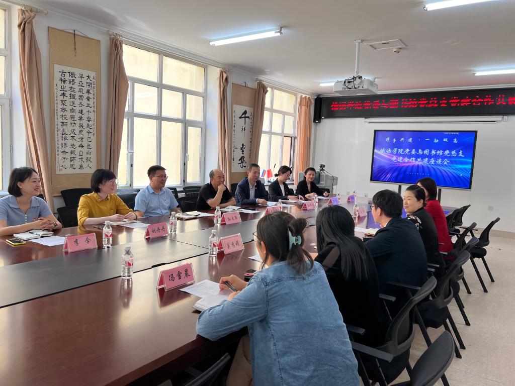 俄语学院党委书记黄东晶对图书馆领导老师的到来表示欢迎。她详细介绍了学院党委的基本情况、党支部党建工作和业务工作基本情况,分享了党建工作经验做法。图书馆党总支书记安树宝介绍了图书馆党总支工作情况,并结合调研工作,就下一步建立良好的党建合作共建长效机制进行了深入交流。