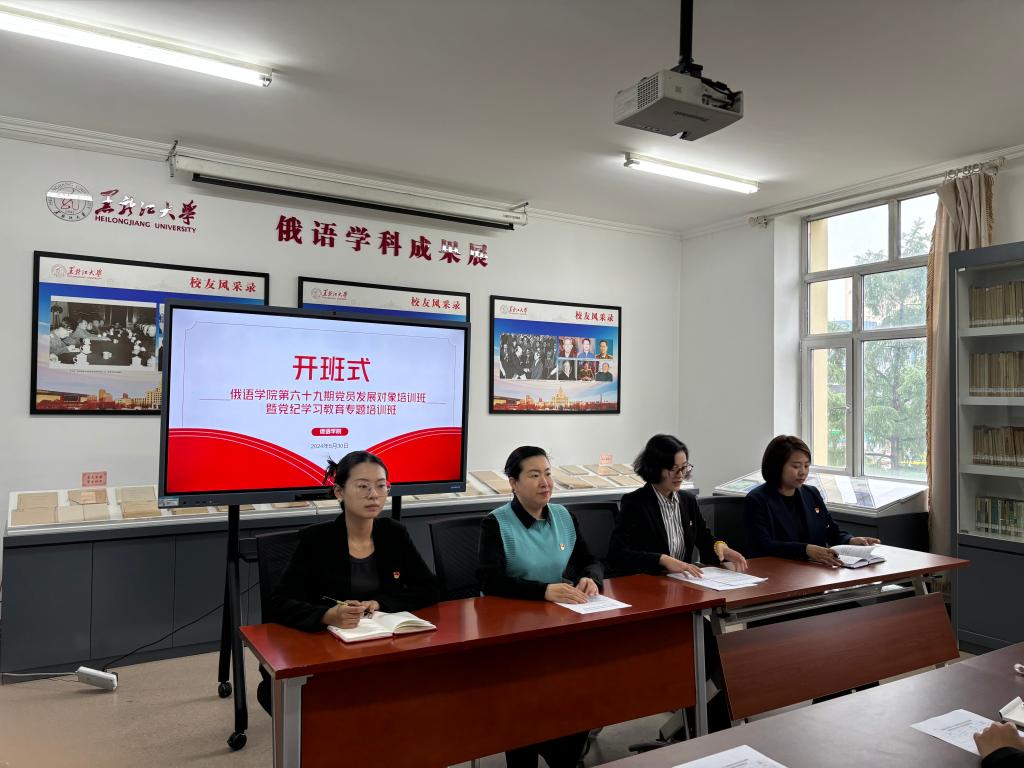 为深入学习贯彻习近平新时代中国特色社会主义思想,贯彻落实习近平总书记关于党纪学习教育的重要讲话和重要指示精神,进一步做好党员发展对象的教育、管理和培养工作,按照关于举办黑龙江大学第六十九期党员发展对象培训班暨党纪学习教育专题培训班的通知要求,俄语学院党委于2024年5月30日在主楼A431室召开第六十九期党员发展对象培训班暨党纪学习教育专题培训班开班式,学院党委书记黄东晶、组织员王昱蘅、学生党支部书记郭晓彤、马禹茜和第六十九期党员发展对象培训班全体学员参加开班式。