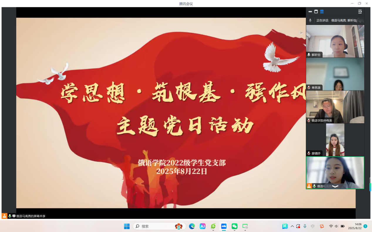 为深入学习贯彻习近平新时代中国特色社会主义思想,扎实推进深化能力作风建设,俄语学院党委所属各党支部于8月17日-8月22日期间,以线上线下相结合的形式,扎实开展“学思想·筑根基·强作风”主题党日活动。活动聚焦习近平总书记最新重要讲话精神和《习近平关于加强党的作风建设论述摘编》等内容,结合学科和专业特色展开讨论,深化理论实践融合,为服务国家战略筑牢思想根基。