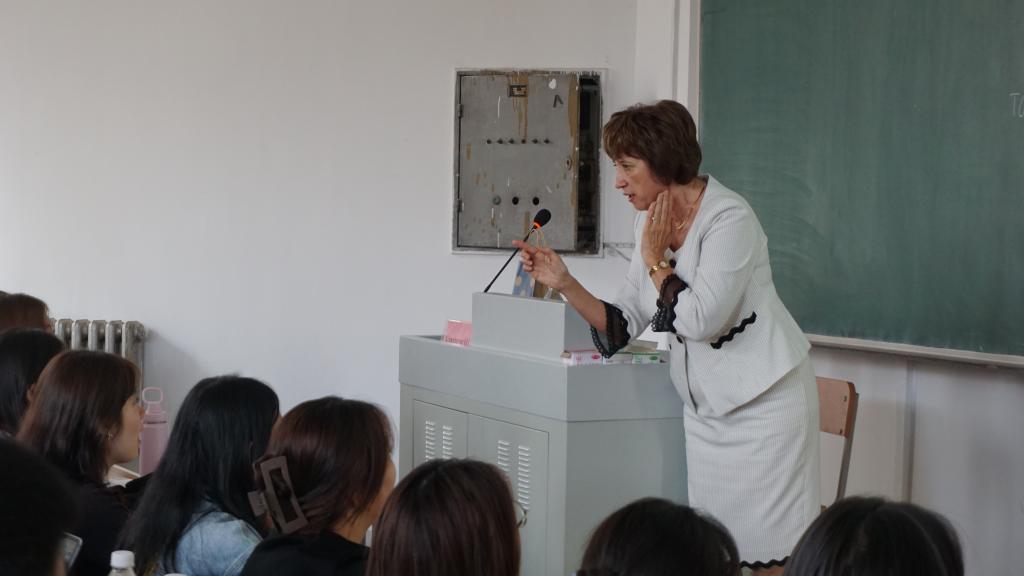 第三场活动则是面向全体俄语学院师生的《标准俄语入门:大一新生语音启航课》,本次观摩课不但为全体大一新生带来了一场别开生面的语音实践教学,也其他俄语学院师生巩固俄语语音基础提供了机会。活动现场人气高涨,教室座无虚席。课堂上,奥莉加·科罗特科娃凭借自身丰富的对外俄语教学经验和深厚的语言功底,将原本枯燥的语音训练变成了一场充满欢声笑语的探索之旅,她以生动形象的方式拆解俄语发音技巧、语调规律等核心知识点,不但针对新生易混淆的语音问题逐一示范讲解,还以极其标准的发音为新生们耐心示范、逐一纠正,用轻松幽默的语言调动课堂氛围,让同学们深刻地体会到了俄语语音的韵律之美。她的教学既注重专业性又兼顾趣味性,有效调动了学生的积极性,现场互动频繁,学生主动举手回答问题、参与发音练习,教师们也认真记录学习,课堂氛围活跃高效。