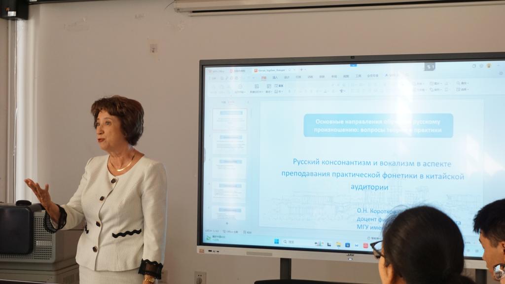 第四场讲座则面向俄语学院的教师群体,本场讲座以《俄语语调体系的教学策略与实践应用》为题,比较了俄语中八型调型的差异,从学理脉络梳理到教学案例解析,层层递进。她不仅结合案例仔细分析了不同调型的使用情景,更亲自示范了各个调型如何正确应用。她专业的示范与讲解,不仅为教师们解决了一线教学中的实际难点,更启发了对俄语调型研究的深度思考。