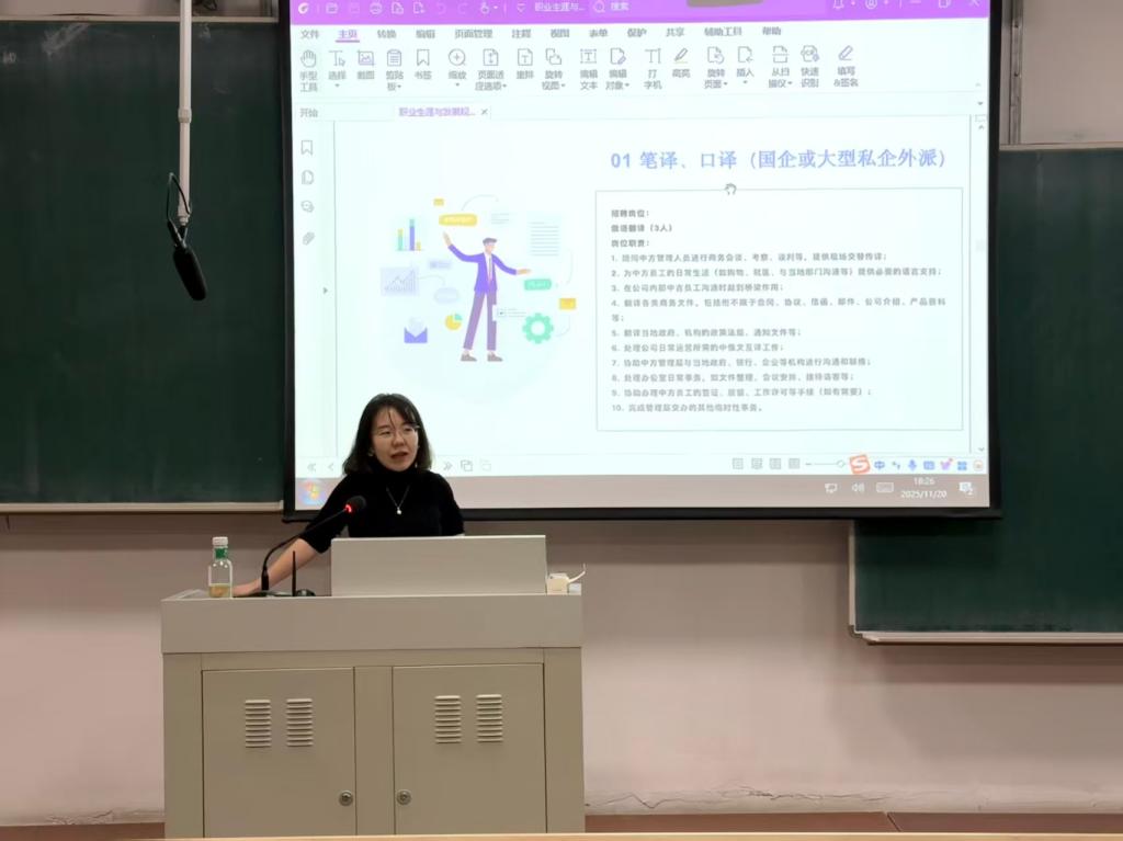 为帮助2025级新生夯实专业基础、明确发展方向,提升职业规划能力与综合素养。俄语学院于11月20日18:00举办了2025级学生职业规划专题讲座。本次讲座特邀黑龙江大学外国语言文学博士后流动站在站博士后,助理研究员张月萍担任主讲,2025级辅导员李宏磊主持,2025级全体本科生参加。