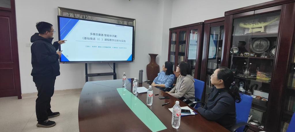 孙秋花以《理解当代中国·俄语演讲》为依托,围绕“讲好中国故事”主线,通过精选演讲文本与实践训练相结合的方式,实现价值引领与语言能力培养有机统一,助力学生提升跨文化沟通素养。何洋洋老师聚焦《基础俄语Ⅰ》课程,深度融合智能技术构建多模态教学环境,借助智能语音训练、实时互动及个性化学习路径设计,探索传统语言教学与数智技术的创新融合。