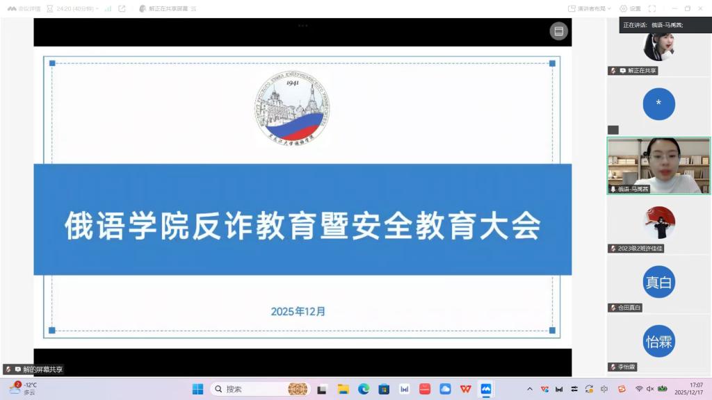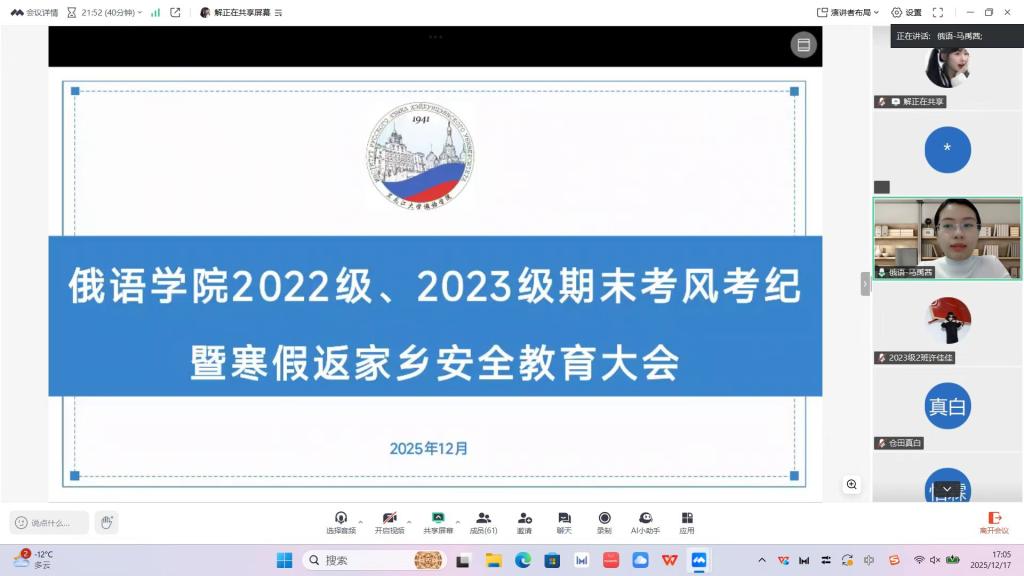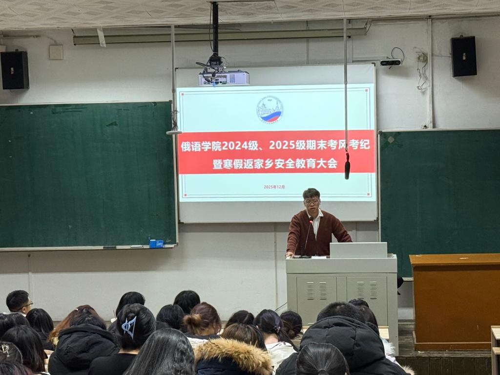 为持续推进学院学风建设,严明考试纪律要求,夯实学生的假期安全根基,着力增强全体学生的诚信应考意识与安全防范意识。12月17日,俄语学院各年级召开了考风考纪教育暨假期安全教育大会。