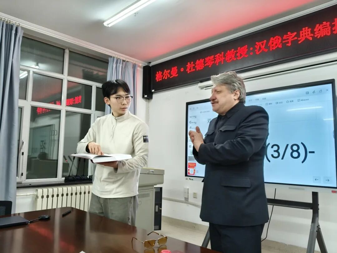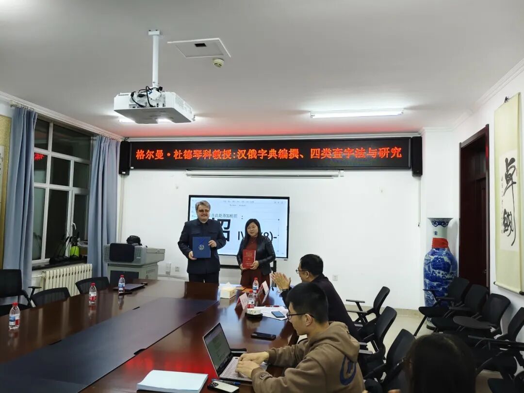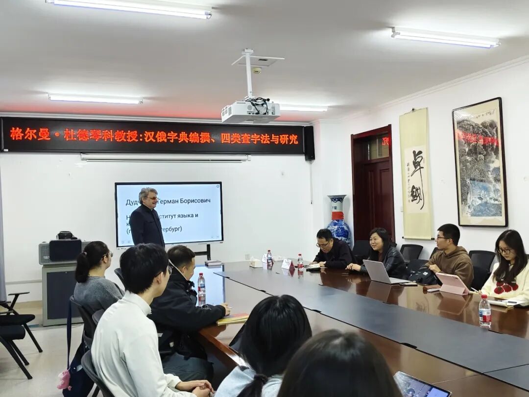 11月27日,为探索词典学研究前沿、深化中俄学术交流,黑龙江大学俄语学院特邀圣彼得堡涅夫斯基语言与文化学院格尔曼·杜德琴科教授莅临讲学,作题为《汉俄词典四类查字法》的学术报告。报告会由李海斌副教授主持,学院领导及师生代表齐聚会场聆听,并与专家展开热烈的学术研讨。