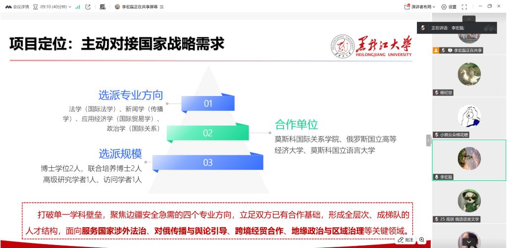 李宏磊重点梳理了俄方合作院校的办学特色与学科优势,提醒申报学生立足自身专业方向,全面精准评估与院校的适配性,科学合理地规划志愿填报顺序,以提升申报匹配度。同时,他明确指出该项目重点吸纳拥有跨学科背景的复合型人才,鼓励相关学生积极申报,切实契合边疆安全、对俄合作等关键领域的战略人才需求。