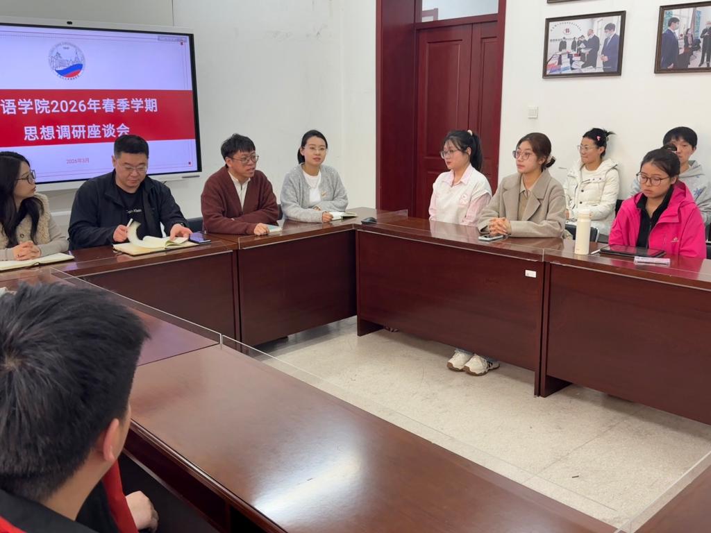 为精准把握新学期学生思想动态,扎实推进学生教育管理与服务工作提质增效,3月23日下午,俄语学院2026年春季学期思想调研座谈会在主楼D422召开。学院党委副书记沈中辉、团委书记李宏磊、团委副书记马禹茜、金鑫及各年级学生代表参加会议。