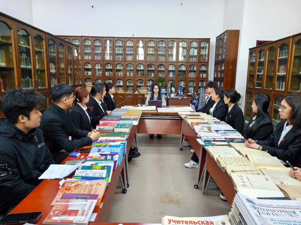 金鑫以《奋进“十五五”青年挺膺担当》为题深入学院资料室进行实景下的主题党课。她从党员权利与义务、党性修养提升、榜样事迹引领等方面展开授课,通过革命先辈与时代楷模的先进事迹,引导学员们感悟精神力量,锤炼过硬党性,明确新时代青年党员的责任与担当。金鑫带领全体学员走进俄语学院资料室开展实践研学,学员们实地观摩专业文献、学术资料,深入了解学院学科建设成果与学术资源储备,在沉浸式实践中深化对专业领域的认知,感悟学科发展与党建工作的融合赋能。
